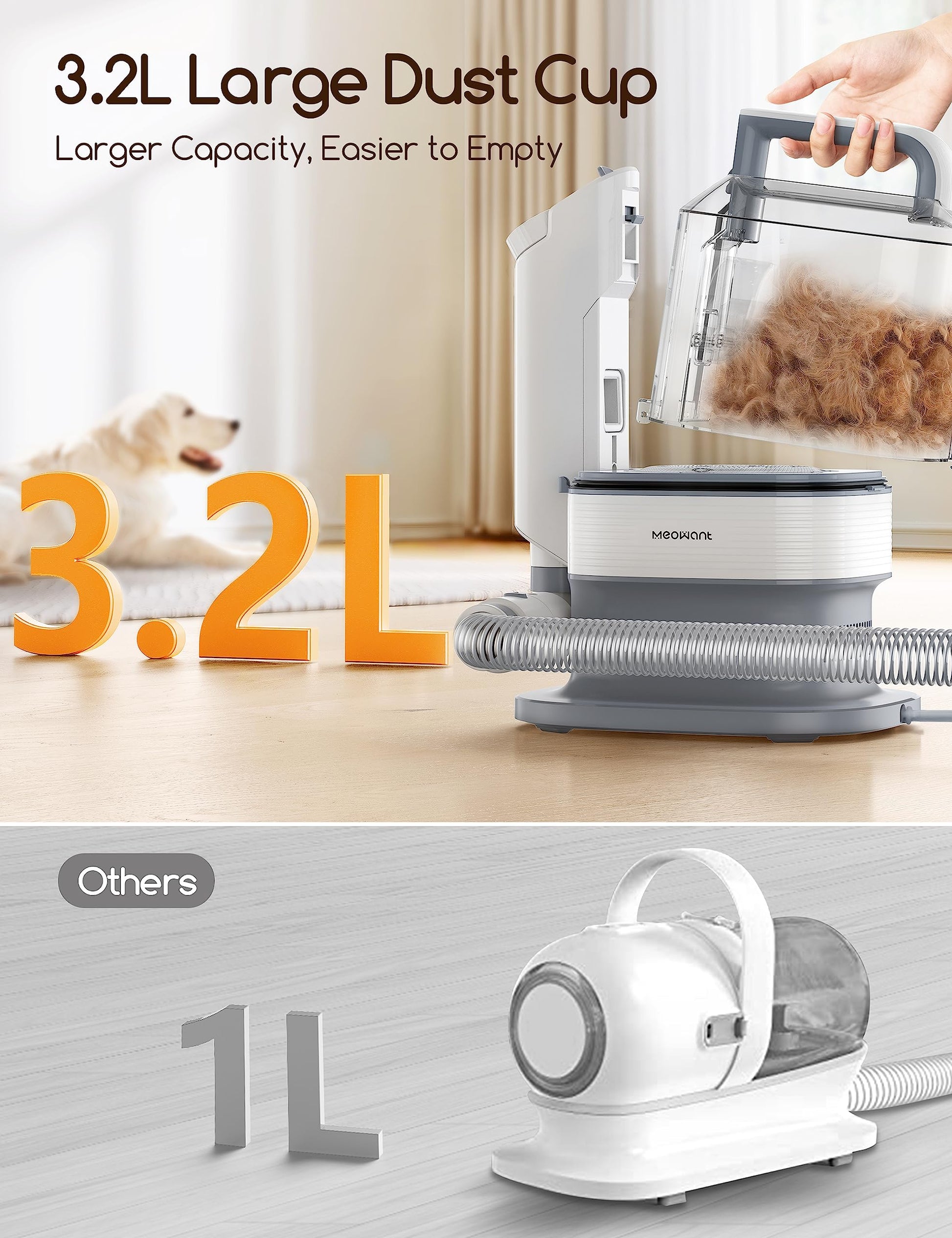 - Depósito para Polvo de Gran Capacidad de 3.2L: Nuestra aspiradora de pelo de mascotas Meowant tiene un recipiente para polvo de mayor capacidad, que es más adecuado para perros grandes con mucho pelo. Y si tienes varios perros, ya no necesitarás limpiar la caja de polvo con tanta frecuencia