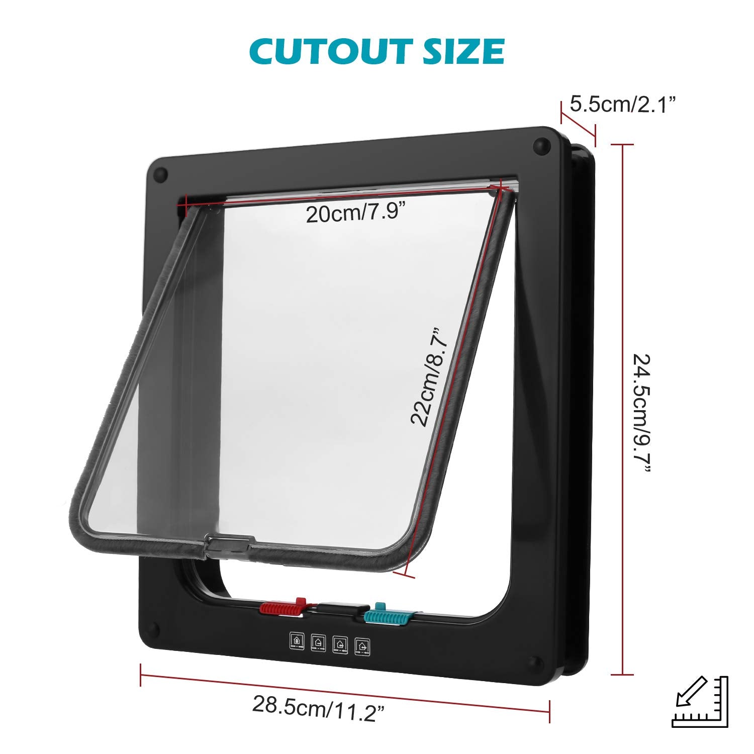 Detalles: Puerta para Gatos Sailnovo 24,5 * 28,5 * 5,5cm, Negra, Talla XL, Puerta para Gatos con Cerradura de 4 vías para Puertas Interiores y Exteriores, Puerta para Mascotas Resistente a la Intemperie